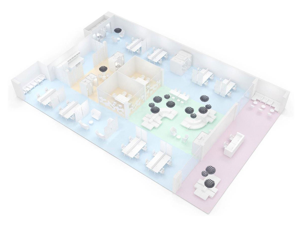 The ACOUSTIC ARTWORK system consists of three types of wall-mounted or ceiling-mounted PET felt products (Partitions, Clouds and Tiles). Besides improved acoustics, these products are also ideally suited for performing other functions: dividing and creating office spaces, and designing a unique interior.