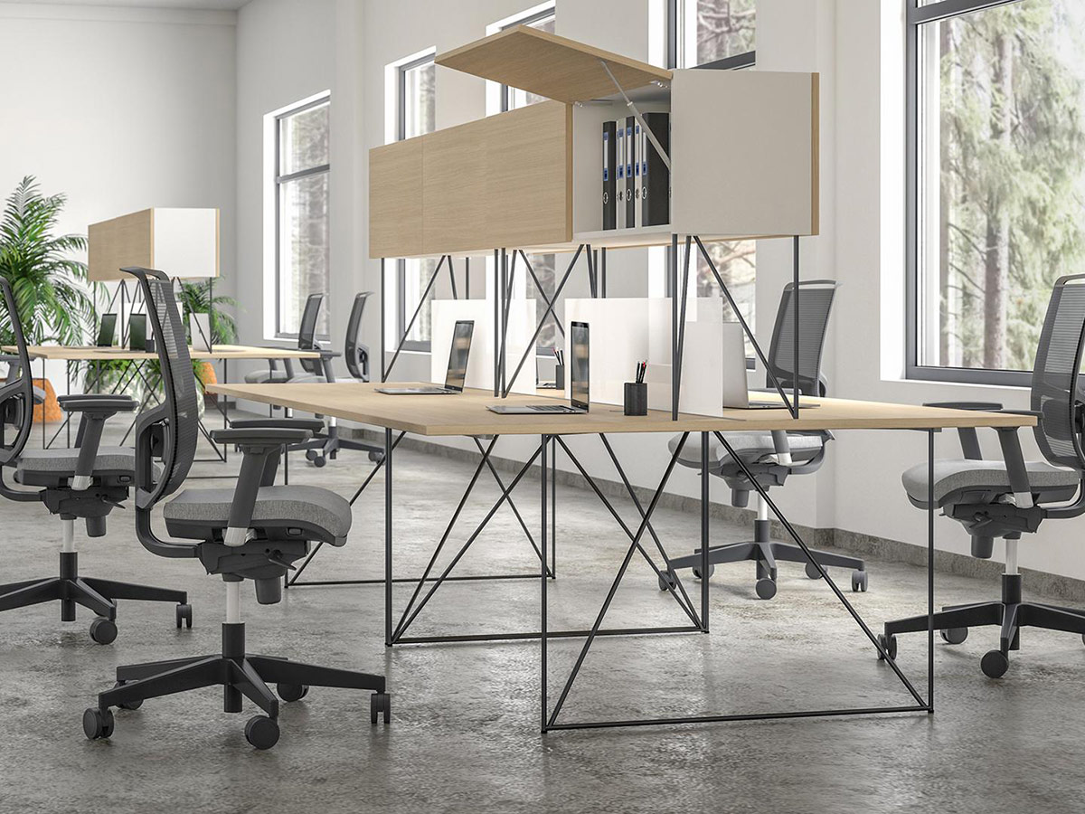 An exceptional feature of AIR desks is thin metal legs that convey a sense of lightness and at the same time ensure their durability and stability. Desk cabinets without handles also help to create and maintain a clean and cohesive look for the office. To make even more efficient use of space, choose a cabinet suspended at hand’s reach above the desk for storing personal items and office supplies.