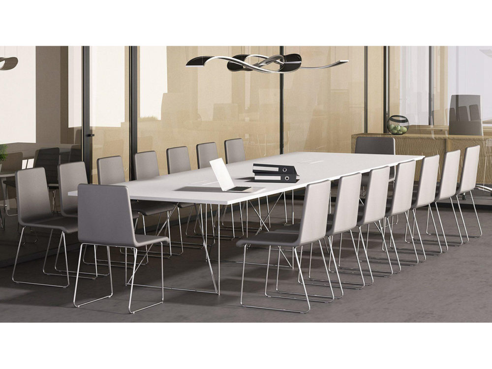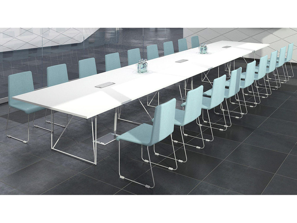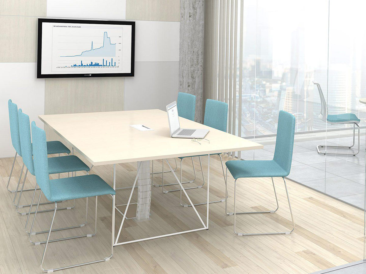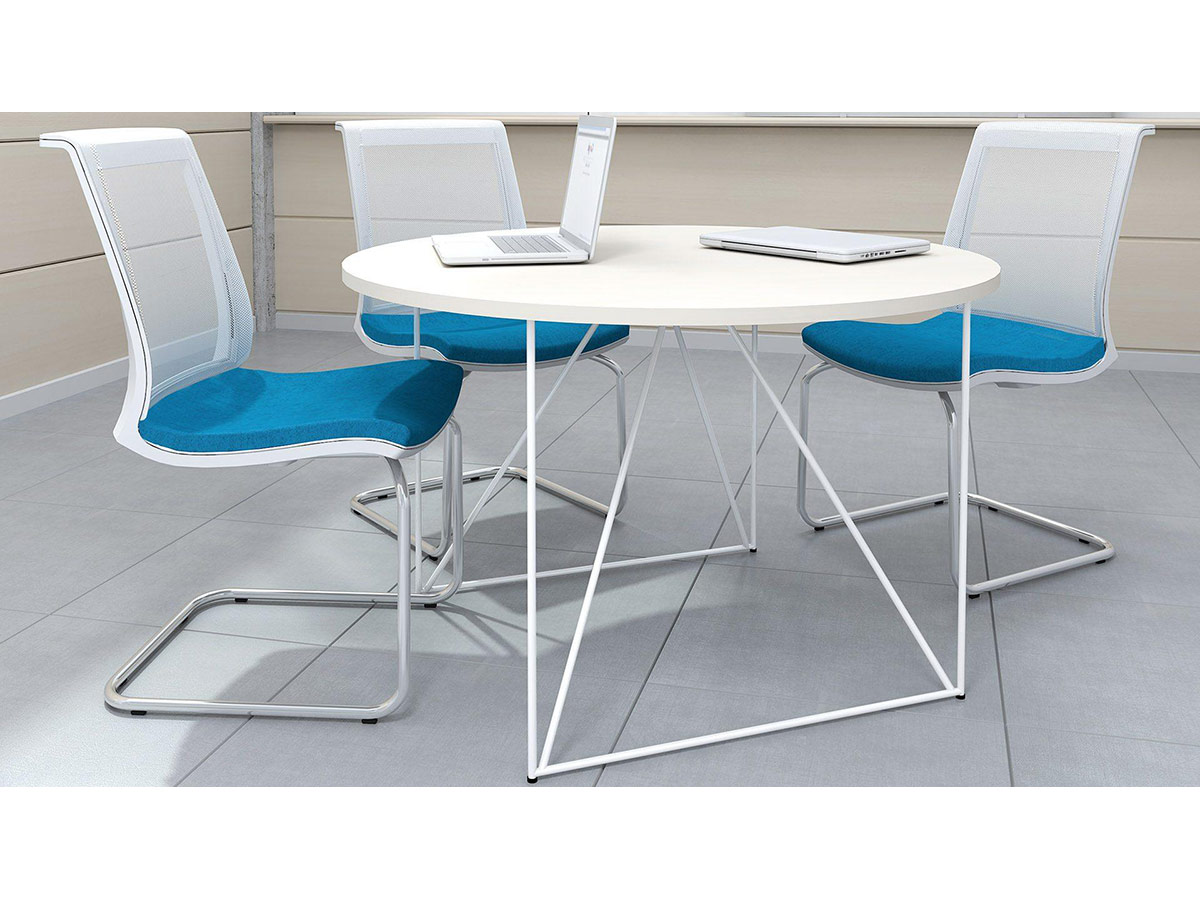 AIR meeting tables feature a round tabletop designed for a team of six people or a rectangular tabletop ideal for eight people.