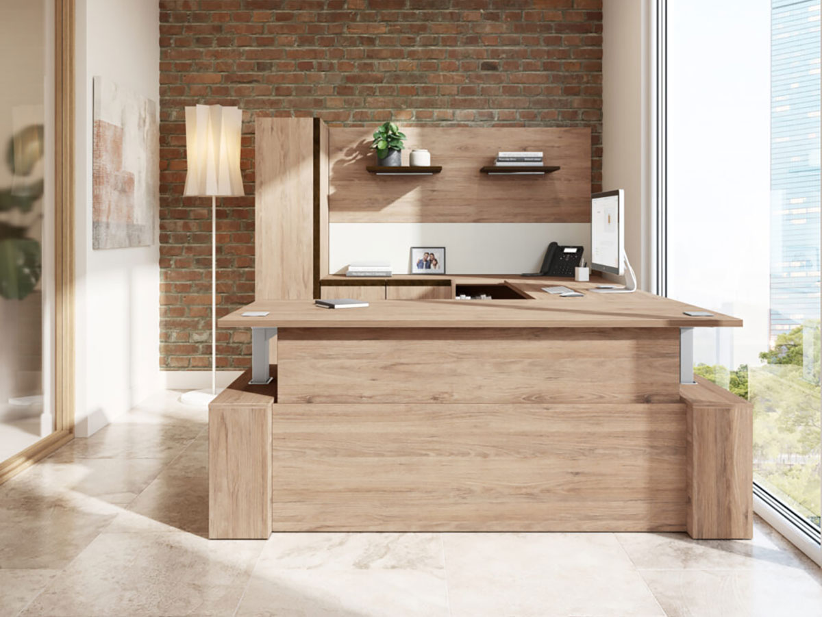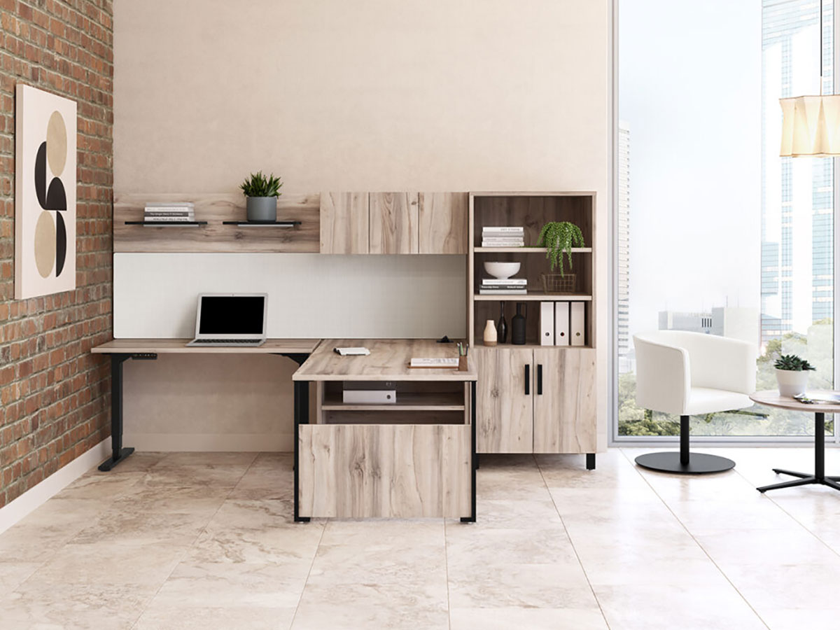 Private office configurations in the Elevation Collection include L-shaped layouts and various modesty panel options.