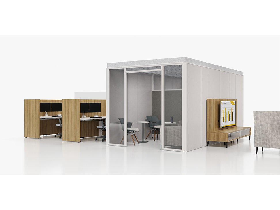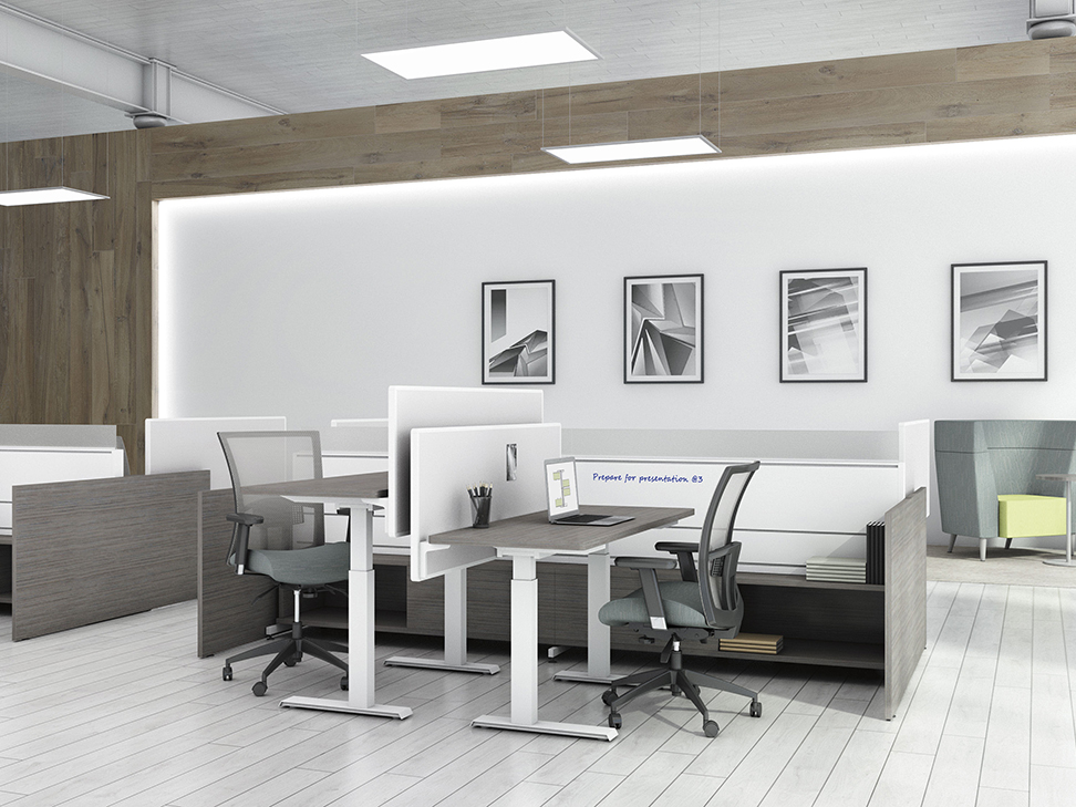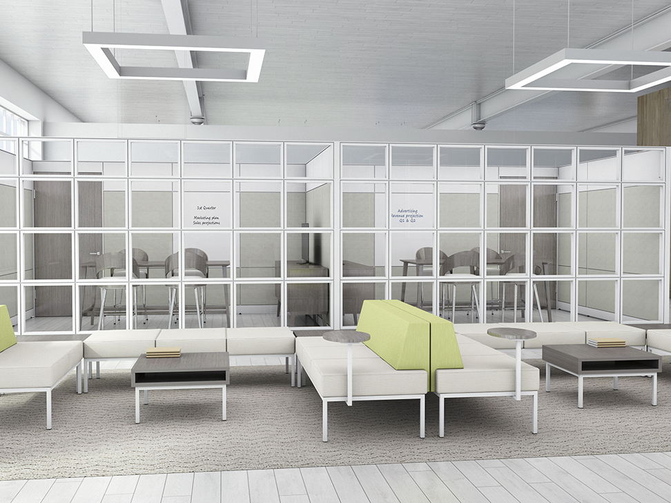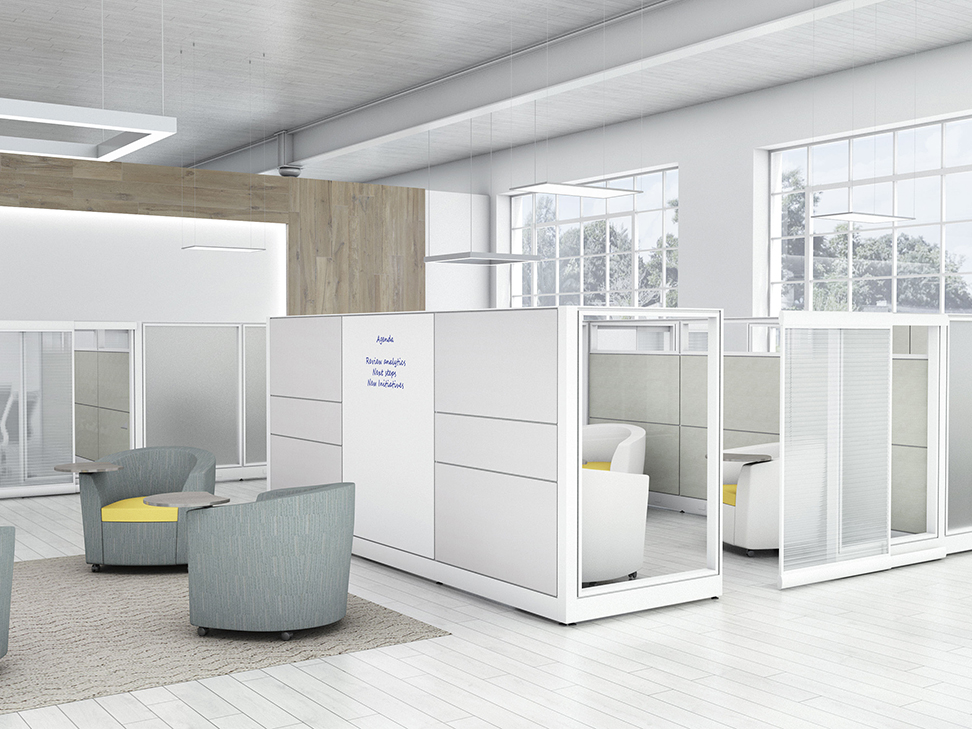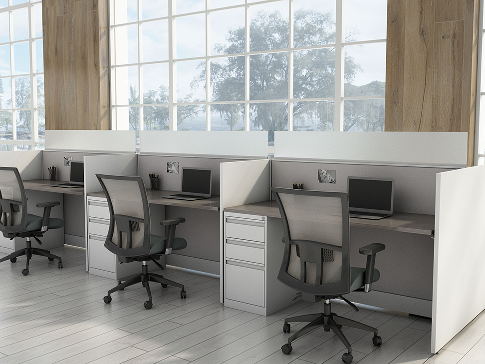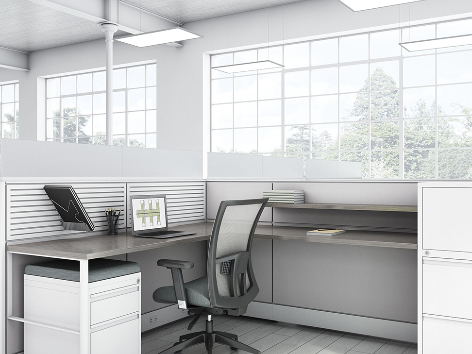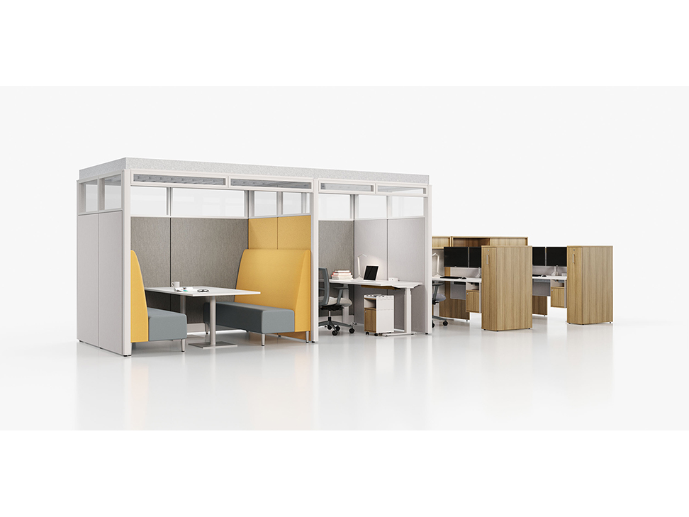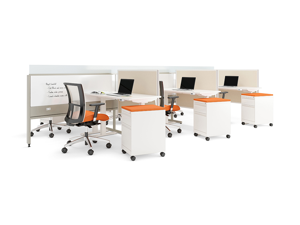Evolve provides the backbone to building complete office landscapes. Stackable panels shape space without relying on existing walls. Fabric, laminate, metal and glass finish options support varying privacy, acoustical and aesthetic requirements.