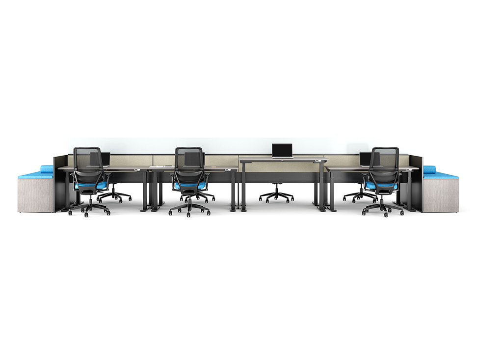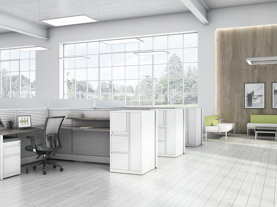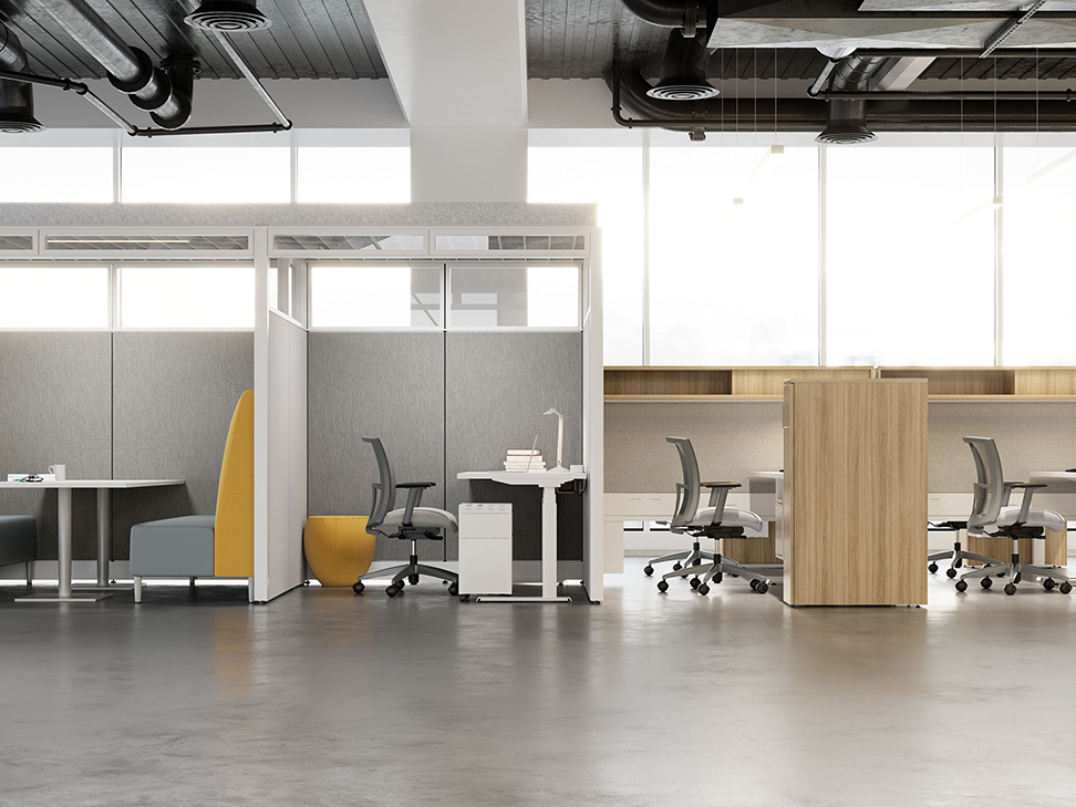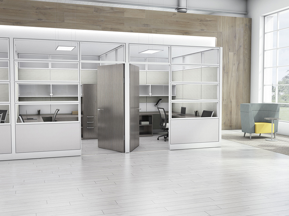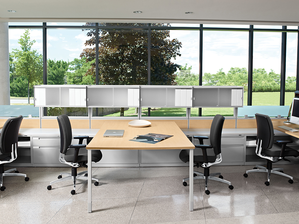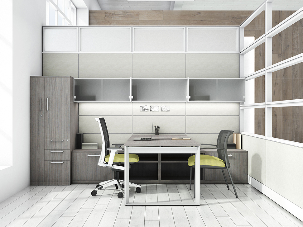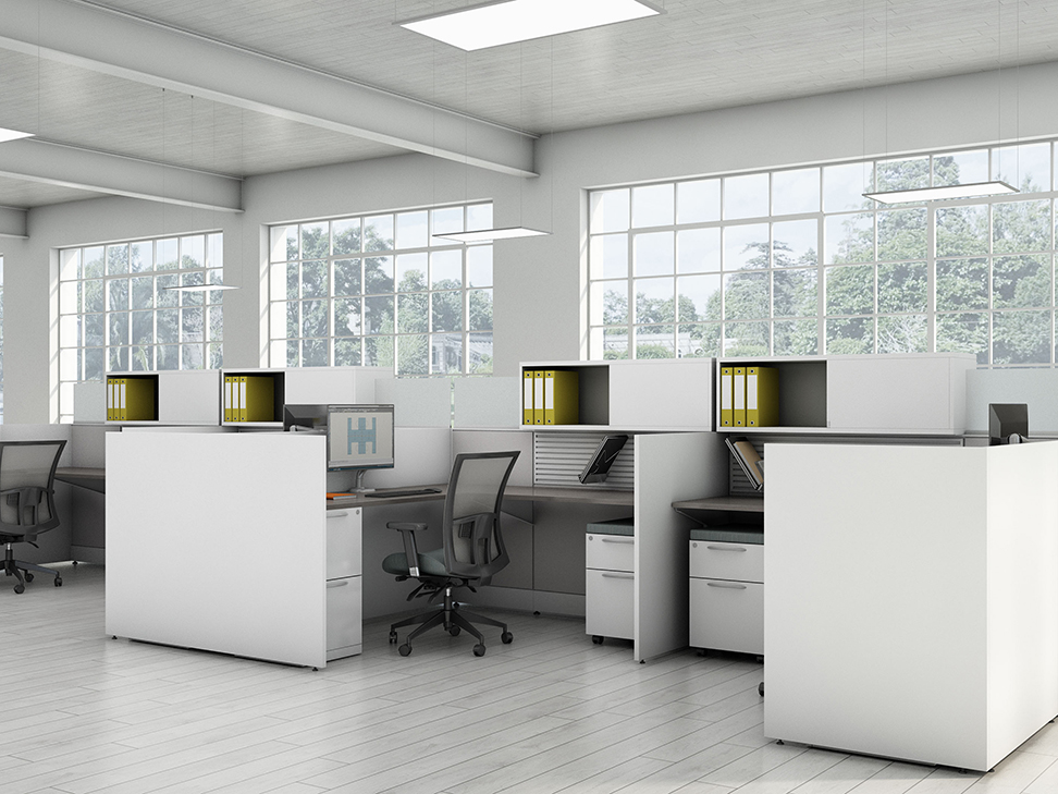 Evolve provides the backbone to building complete office landscapes. Stackable panels shape space without relying on existing walls. Fabric, laminate, metal and glass finish options support varying privacy, acoustical and aesthetic requirements.