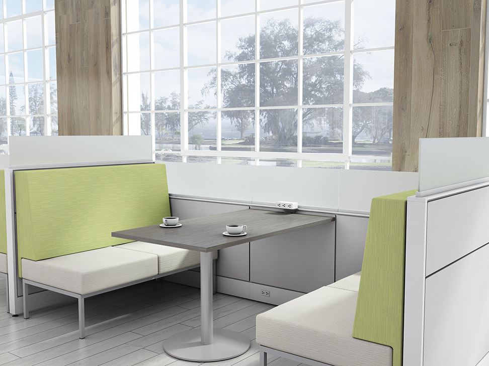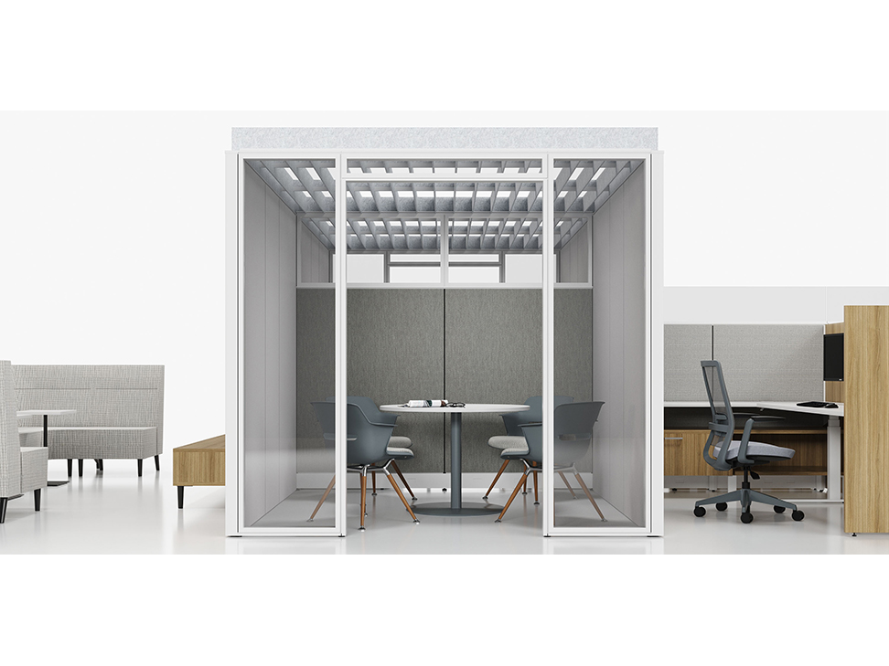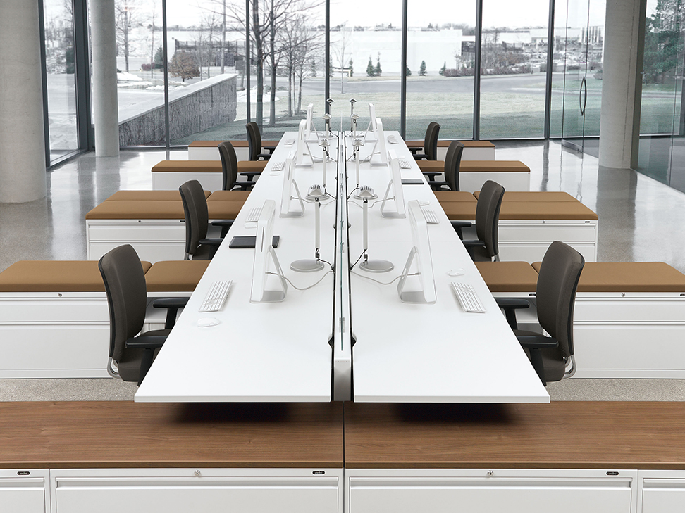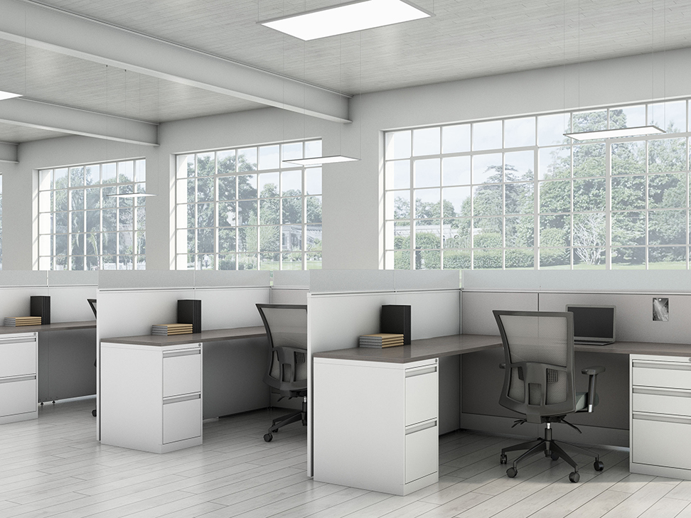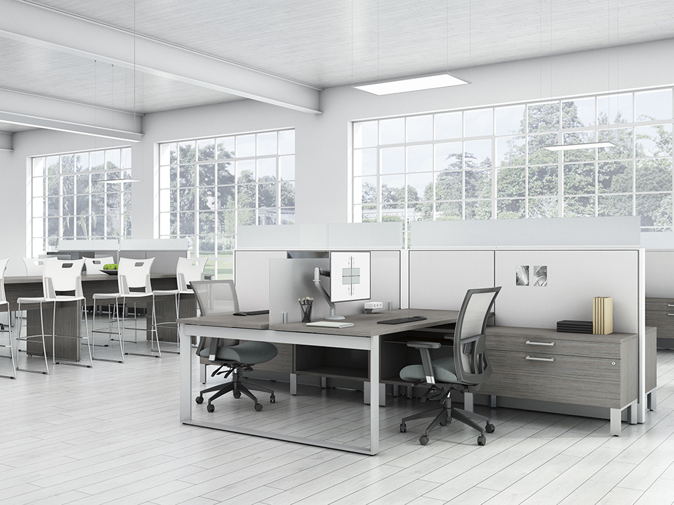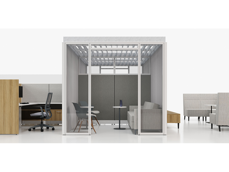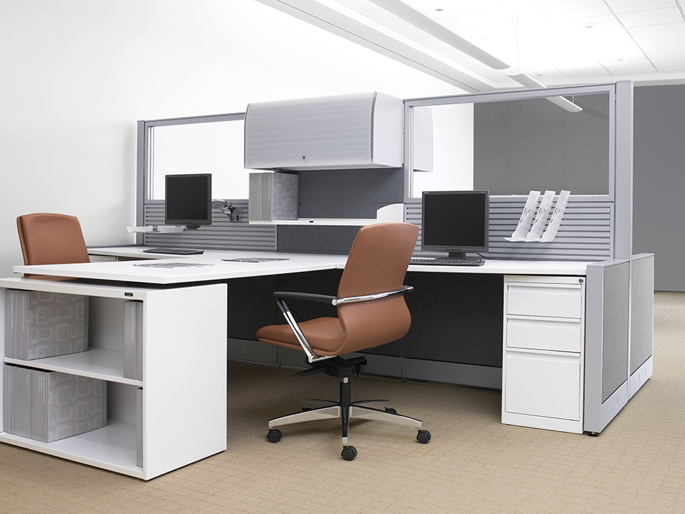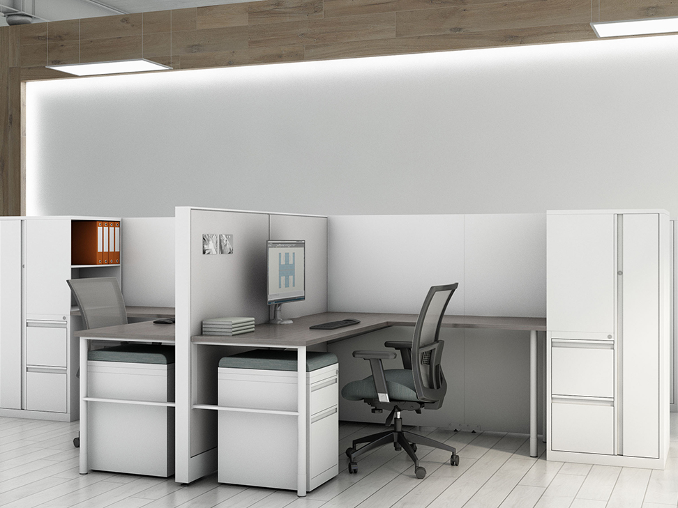 Evolve provides the backbone to building complete office landscapes. Stackable panels shape space without relying on existing walls. Fabric, laminate, metal and glass finish options support varying privacy, acoustical and aesthetic requirements.