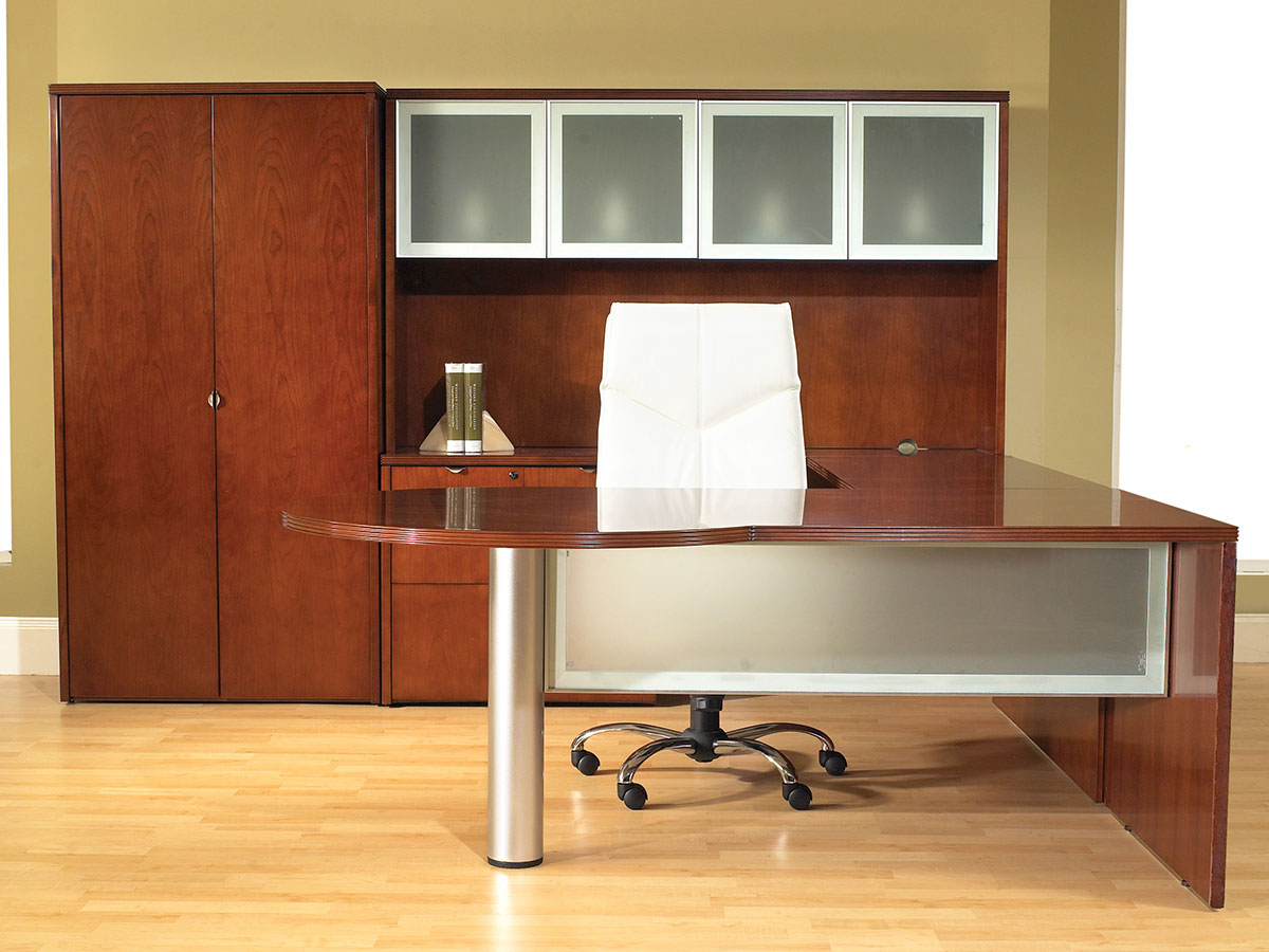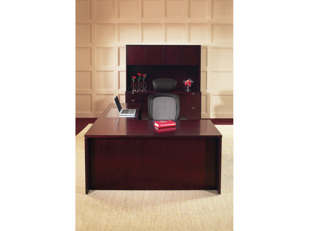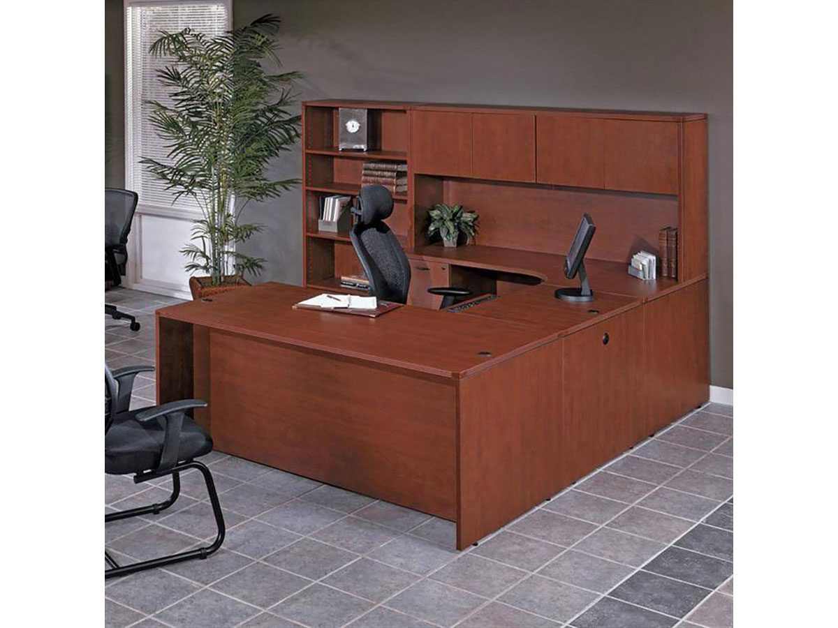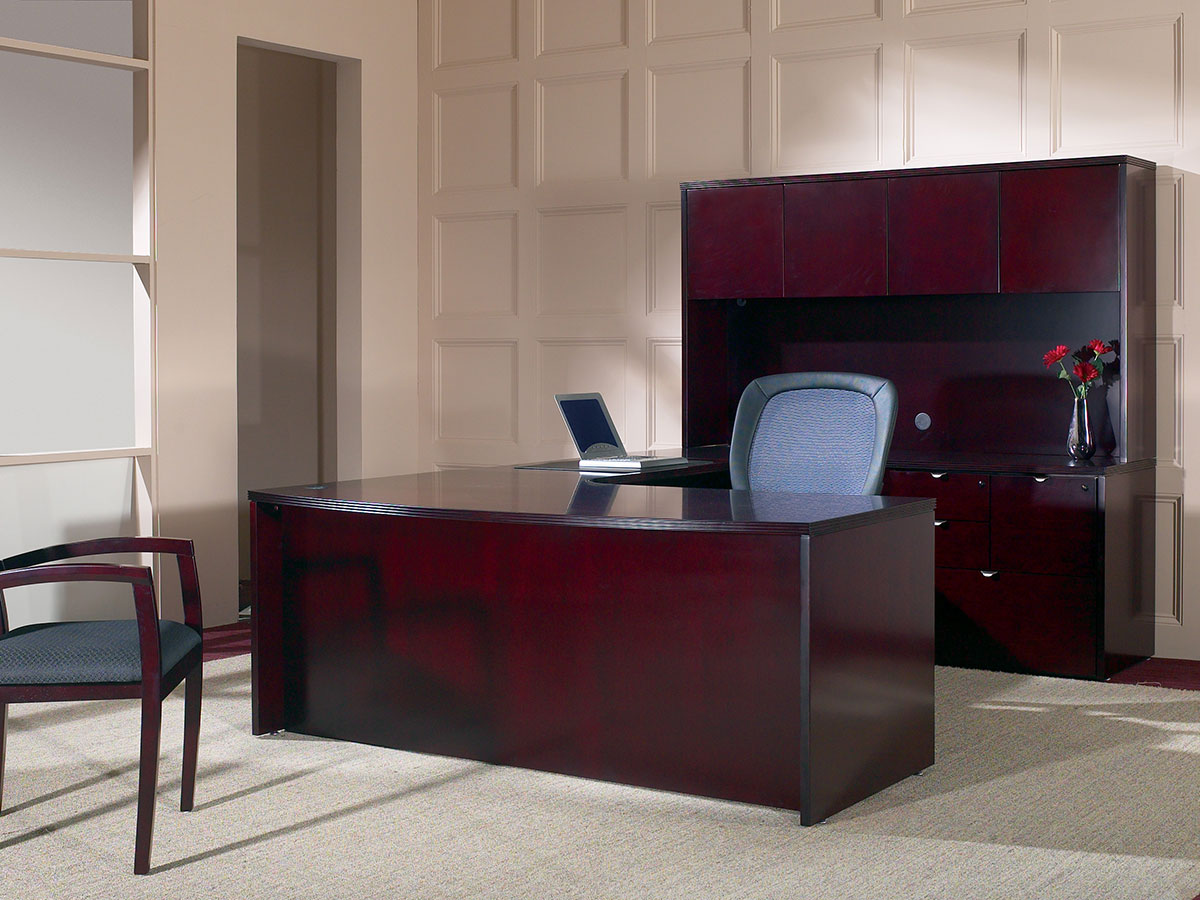 Hardwood veneers are carefully selected and book-matched for the natural beauty of wood. Tops feature common grain direction on all components of L and U shape workstations. All surfaces feature multistep finishes for beauty and durability. Select Mahogany or Light Cherry finish.