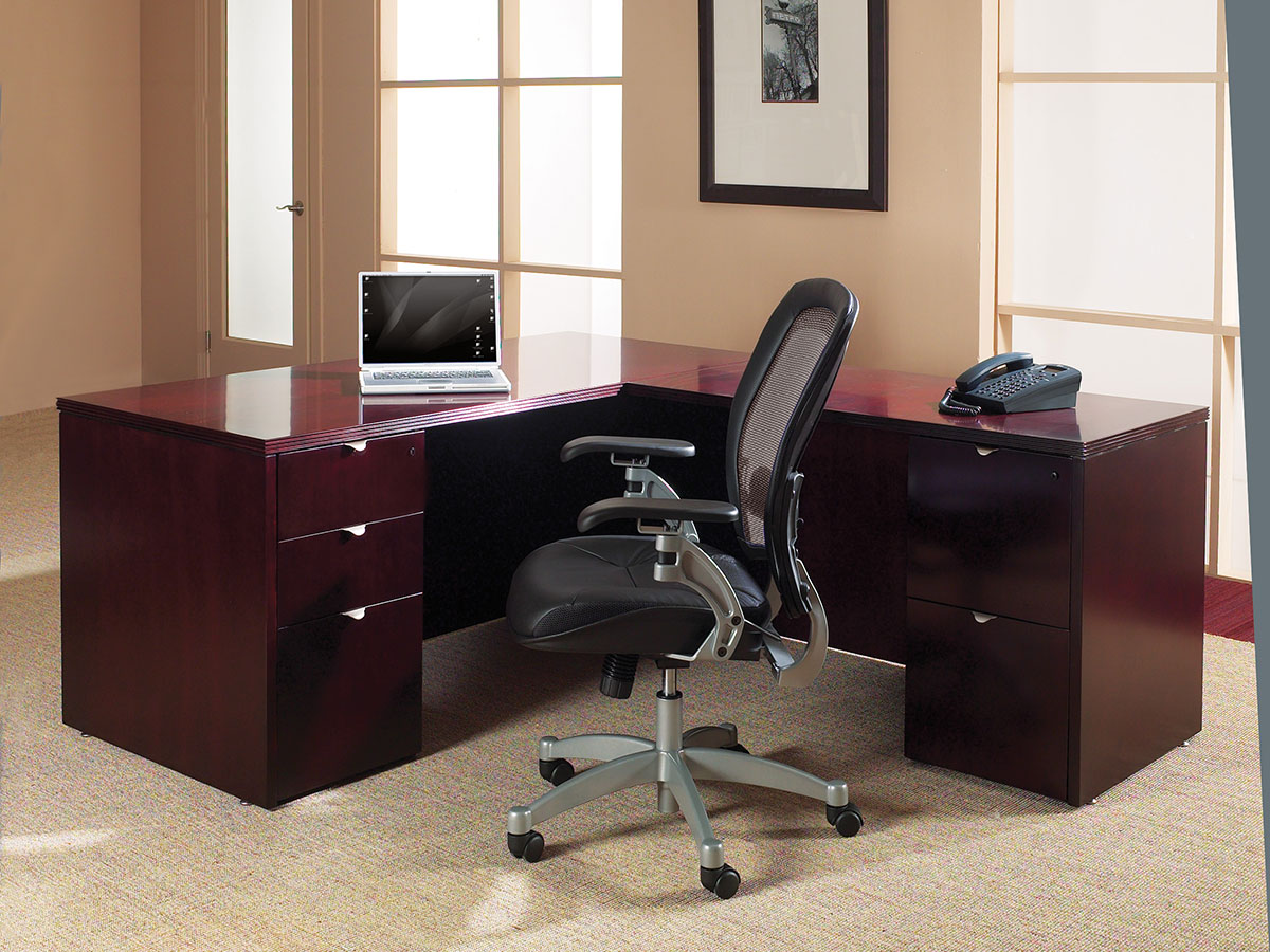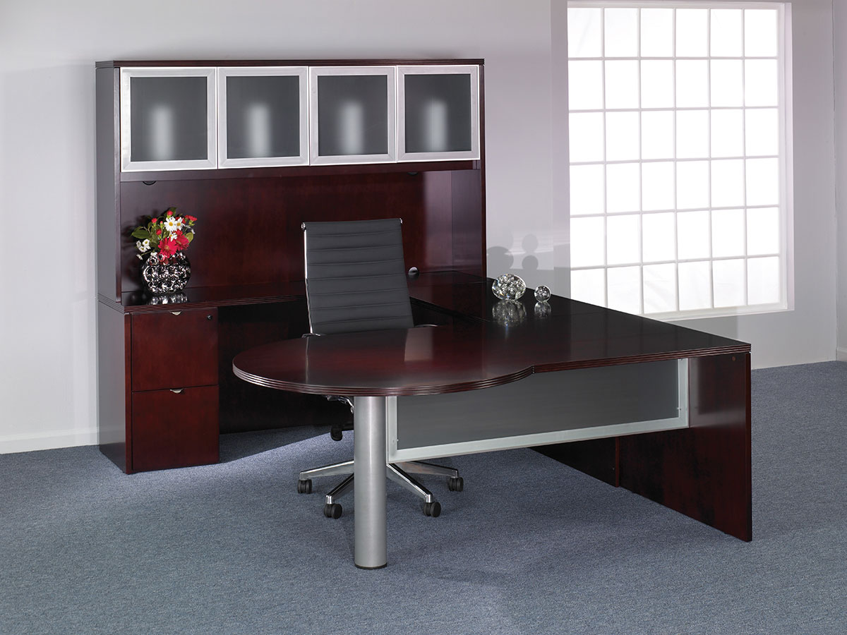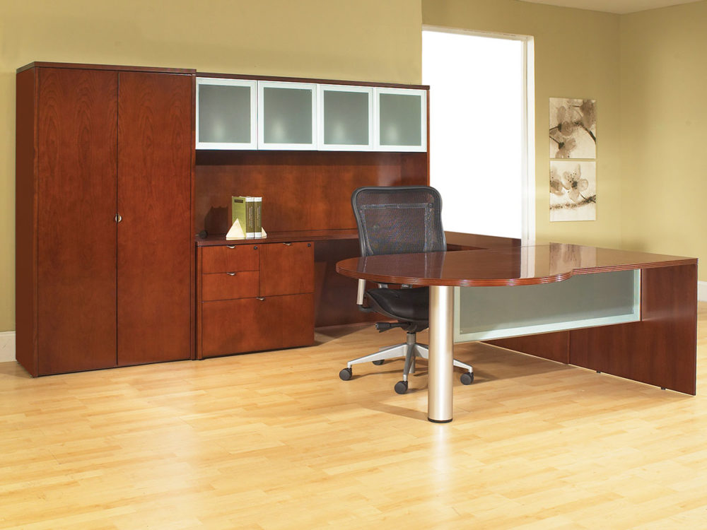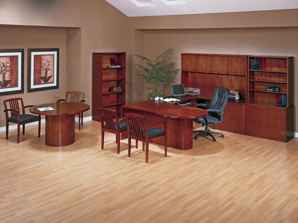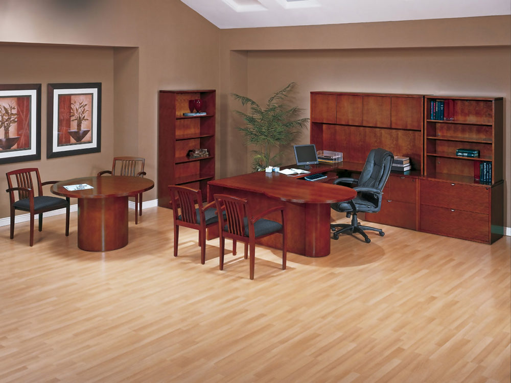 Hardwood veneers are carefully selected and book-matched for the natural beauty of wood. Tops feature common grain direction on all components of L and U shape workstations. All surfaces feature multistep finishes for beauty and durability. Select Mahogany or Light Cherry finish.