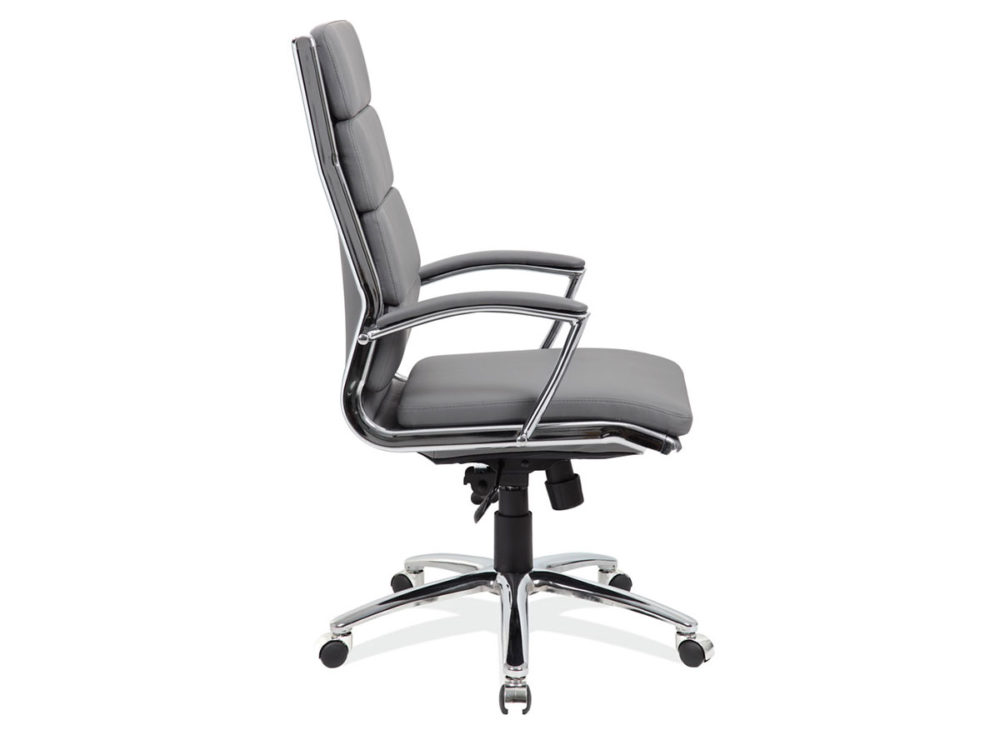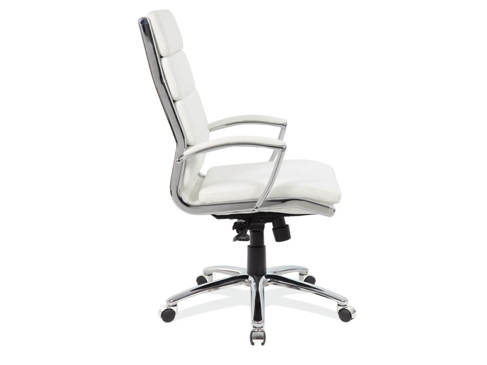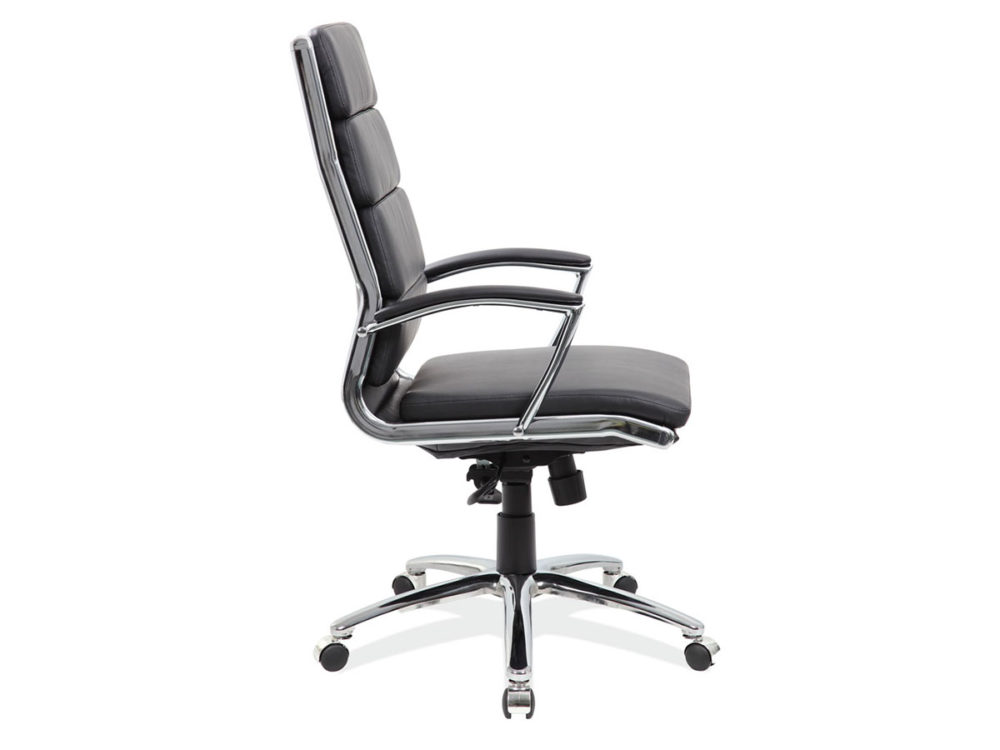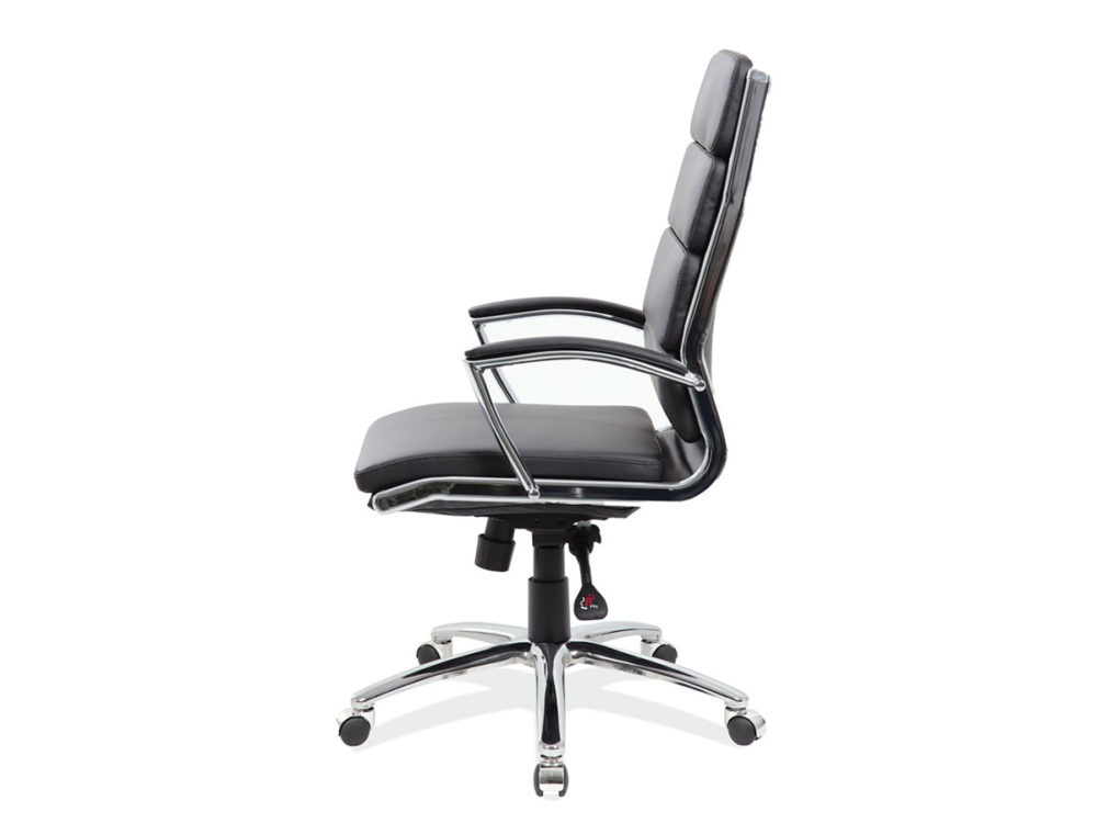 This attractive chair combines form with function in a clean contemporary design. The adjustable height, upholstered in black leather soft vinyl, chrome armrests, 360-degree swivel, and 5-point chrome-rolling base with castors add to its features making it fit for any office situation.