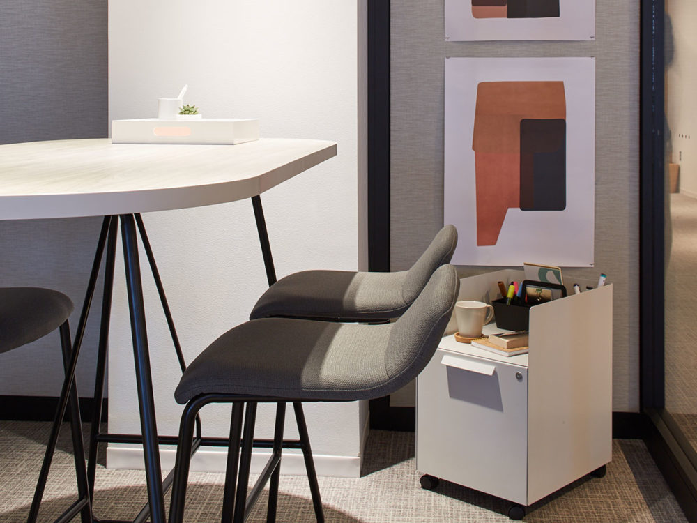 A single sheet of steel wraps the storage unit to provide a clean, soft 360° aesthetic that complements the modern work environment.