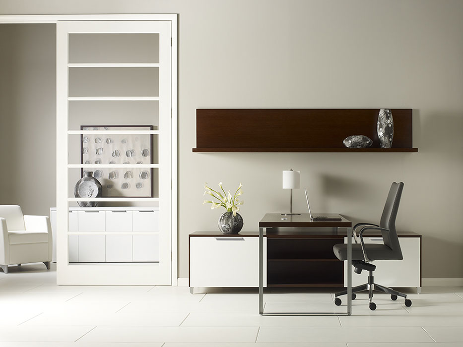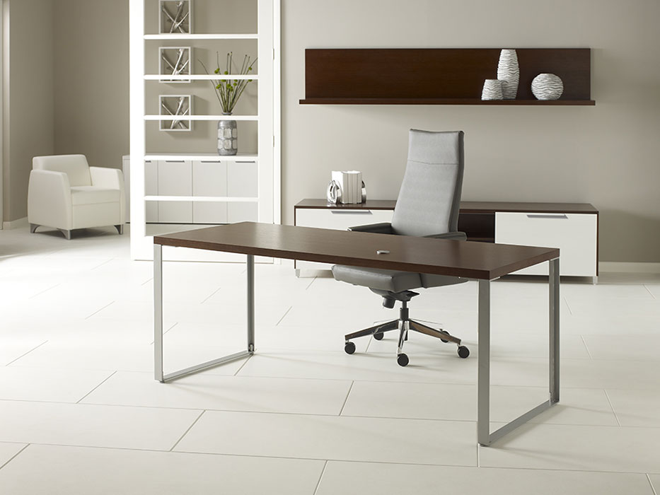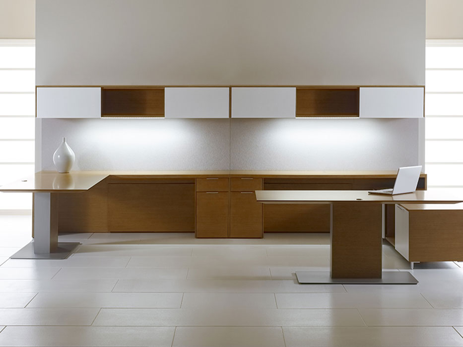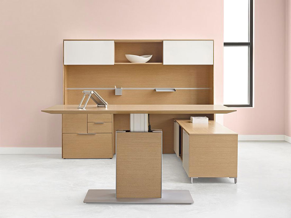 The play on thick and thin is a distinguishing characteristic throughout the Rift collection. Rift takes its name from the rift cut tech grain that runs horizontally on all face planes, creating a unique and striking look. The tech grain, inset panels and monolithic cases create a modern, linear and minimalist aesthetic. Take Rift to a new level with integrated sit/stand technology, available as a stand-alone work/meeting table or in an L or U configuration.