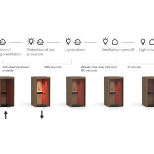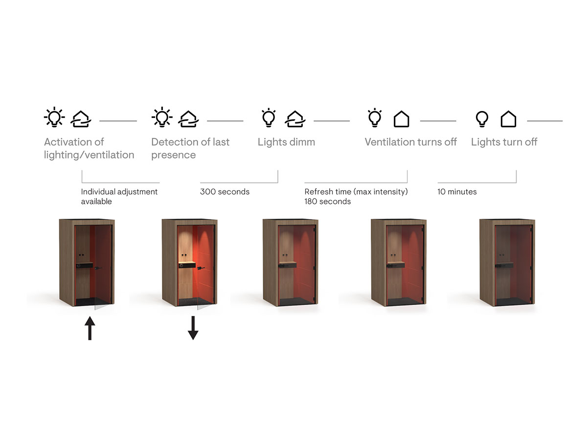 Thanks to its air ventilation and lighting solutions, SILENT ROOM offers a productivity-boosting environment. Ten silent but powerful fans ensure that the air flow rate is just right to provide an ultimate sense of comfort even during extended use. The combination of the six LED lamps creates a warm and homely atmosphere A smart control unit is pre-set to maintain an optimal ventilation and illumination level, and, if necessary, allows for individual adjustment using rotary switches. You will also be able to change general control unit settings according to your specific needs. Once an employee leaves the SILENT ROOM, intense ventilation is automatically activated to prepare the room for the next user. This acoustic piece of furniture also helps with energy savings as it automatically dims the lights when no one is present in the room and even switches them off after some time