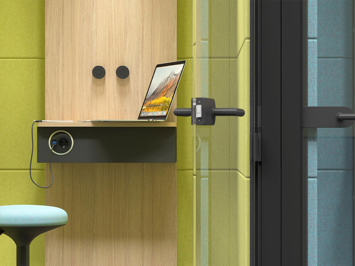 You can enter the SILENT ROOM with confidence as the floor level of the acoustic pod corresponds to that of the surrounding office space and the door of the SILENT ROOM only has a small doorstep that poses no risk of trips or falls. This spacious acoustic pod designed for four users ensures a high level of comfort without limiting your freedom of movement The SILENT ROOM L space allows you to create a personalised setting that suits your needs best. Choose a regular table or a high table with chairs for your team meetings or important business meetings, whereas a coffee table and comfortable visitor chairs or lounge chairs will be ideal for your casual meetings. You can be sure that you will be able to continue important conversation or presentation even if your device runs out of battery power. For users’ convenience, the room is equipped with a power outlet (USB type A and C connectors)Microclimate helps you to concentrate without you even noticing