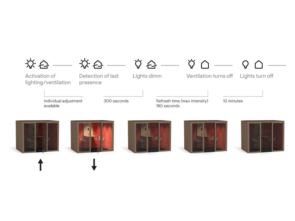 Thanks to its air ventilation and lighting solutions, SILENT ROOM offers a productivity-boosting environment. Ten silent but powerful fans ensure that the air flow rate is just right to provide an ultimate sense of comfort even during extended use. The combination of the six LED lamps creates a warm and homely atmosphere A smart control unit is pre-set to maintain an optimal ventilation and illumination level, and, if necessary, allows for individual adjustment using rotary switches. You will also be able to change general control unit settings according to your specific needs. Once an employee leaves the SILENT ROOM, intense ventilation is automatically activated to prepare the room for the next user. This acoustic piece of furniture also helps with energy savings as it automatically dims the lights when no one is present in the room and even switches them off after some time