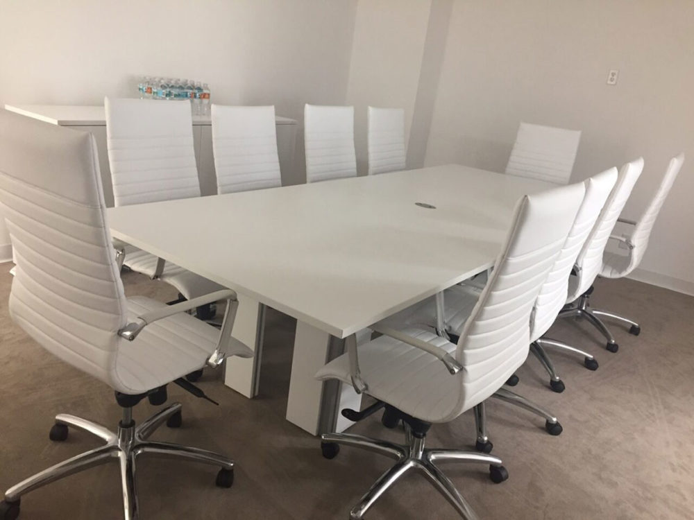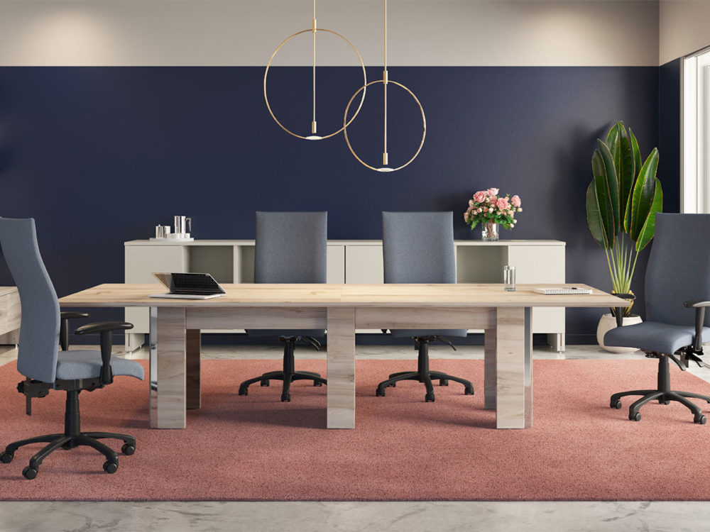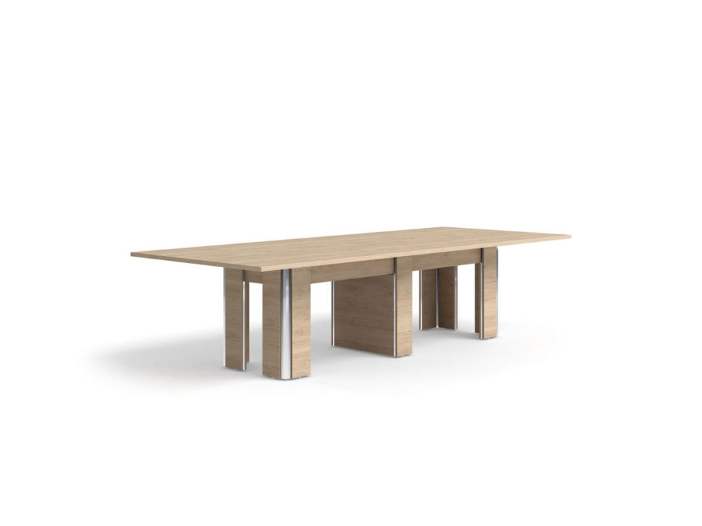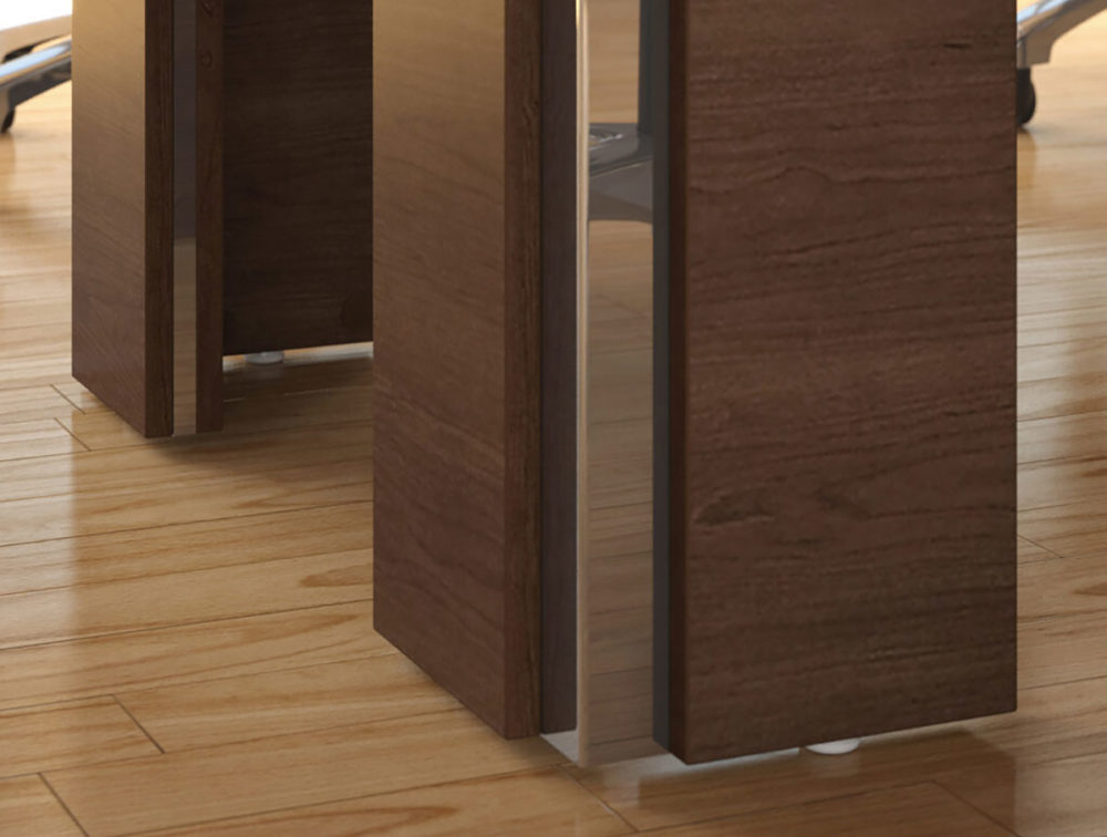 The Wellington conference table will add a stylish touch to your meeting room. With a chrome-accented base, its many surfaces come in a variety of forms. It is equipped with a wire management system that feeds the power supply and communication tools through the table’s surface.